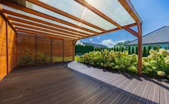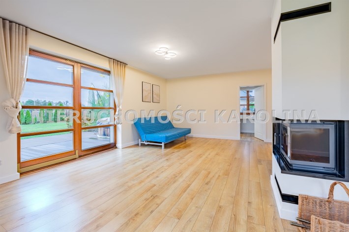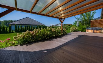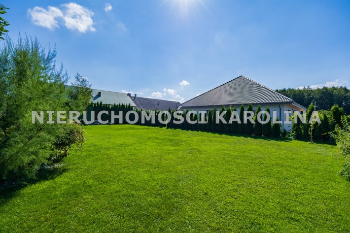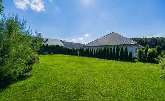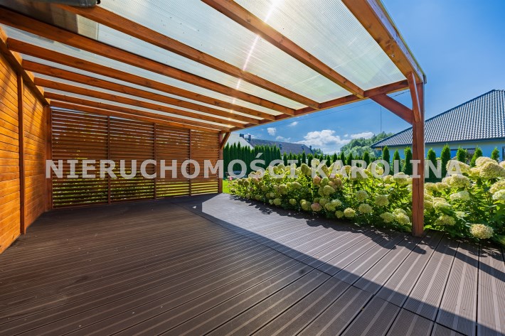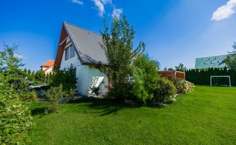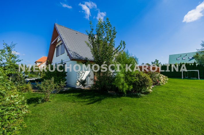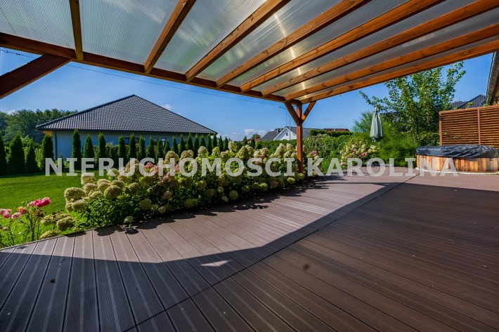 - całkowicie zagospodarowana działka 1327 m² z zadbanym ogrodem i dużym tarasem otoczonym kwiatami i krzewami,