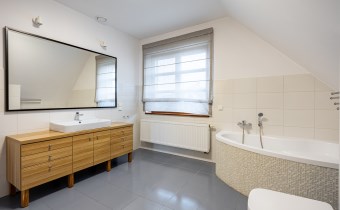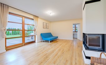 - Podłogi: panele w pokojach, terakota w kuchni, łazienkach i holach.