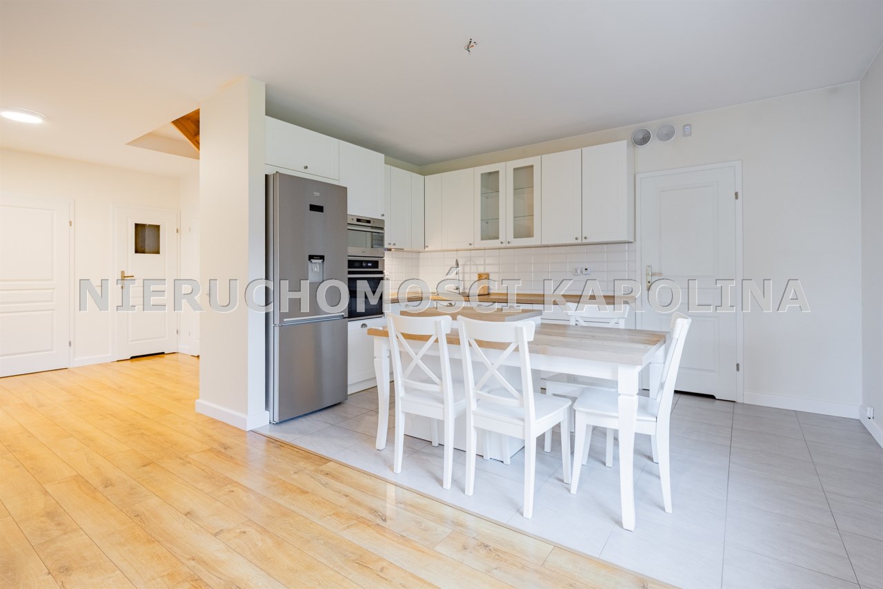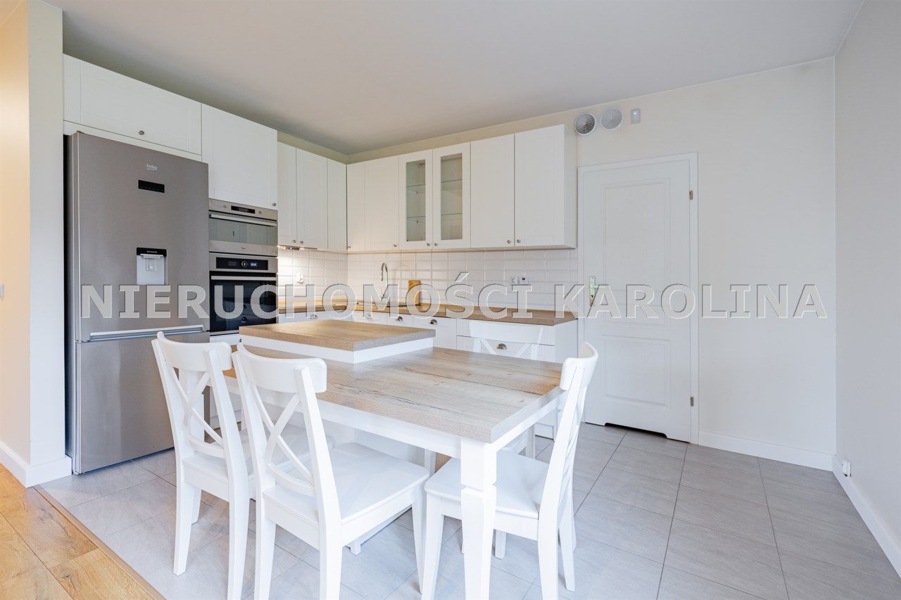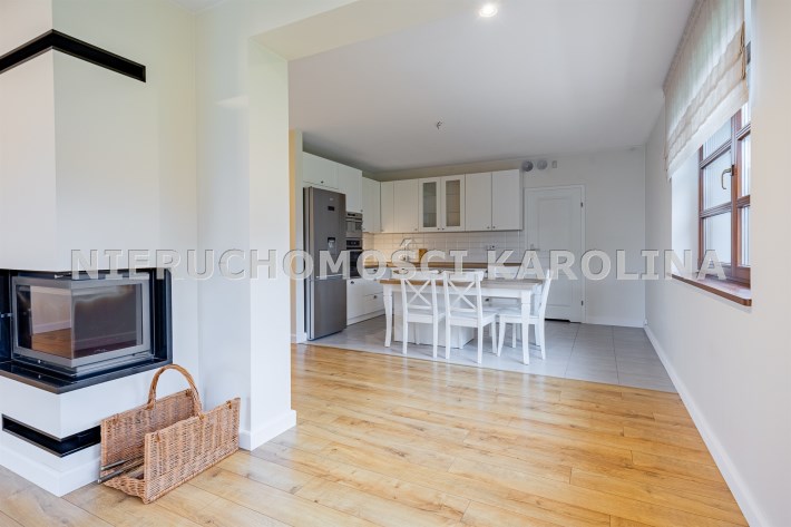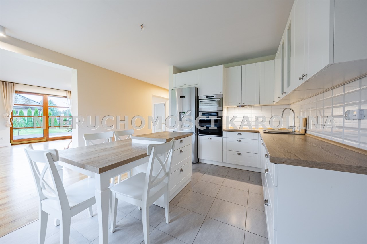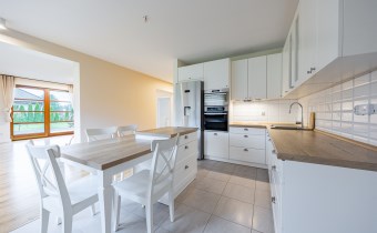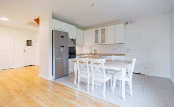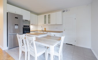 - Kuchnia (18,77 m²) – w pełni wyposażona, z nowoczesną zabudową i sprzętami AGD; na środku wyspa z miejscem na rodzinne posiłki.