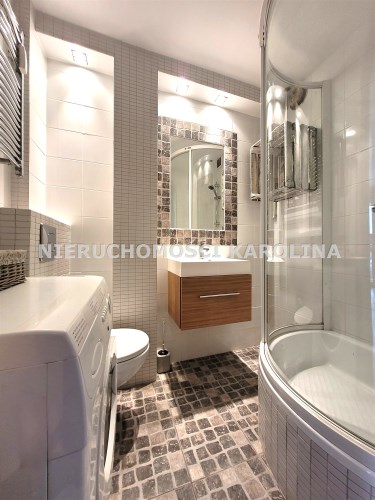 kabina prysznicowa, toaleta, umywalka z szafką, duże lustro, pralka