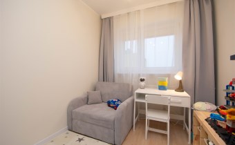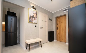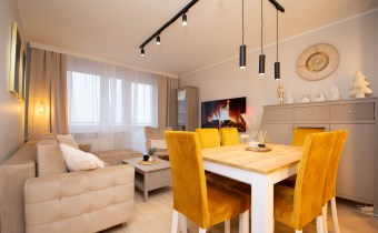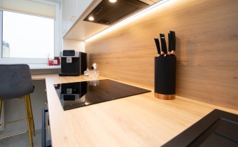 Standard wykończenia i wyposażenie: nowoczesna kuchnia w zabudowie, wyposażona w nowy sprzęt AGD: zmywarkę Beko, piekarnik elektryczny, płytę indukcyjną, okap kuchenny oraz lodówko-zamrażarkę Hisense, mikrofalówkę Gorenje, ekspres Beko z możliwością sterowania smartfonem.