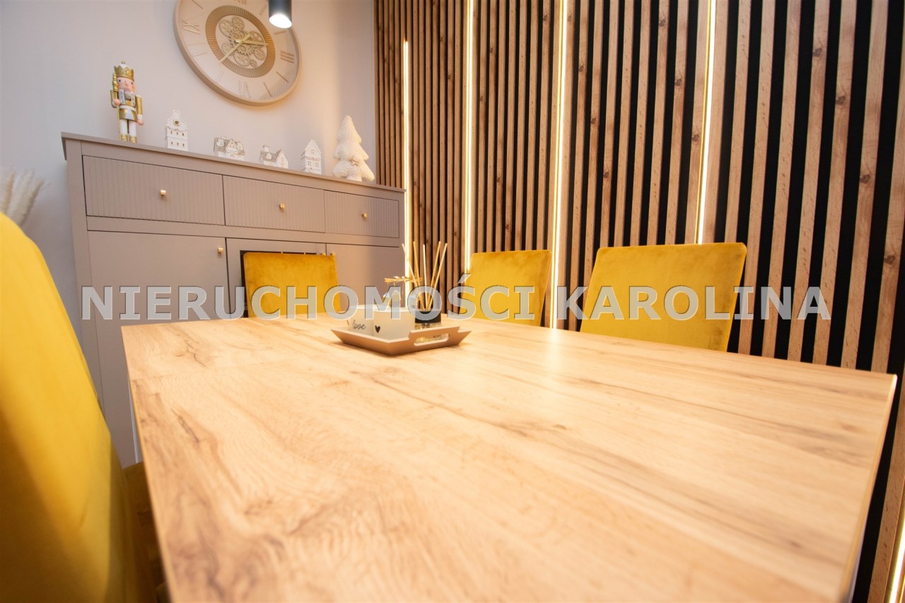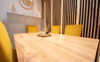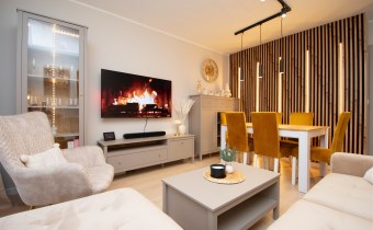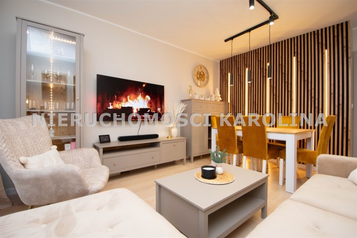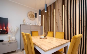 - salon o powierzchni 16,70 m² : w pełni umeblowany z rtv ambilight, na jednej ze ścian stylowe lamele z oświetleniem led, listwa oświetleniowa trójfazowa.
