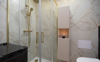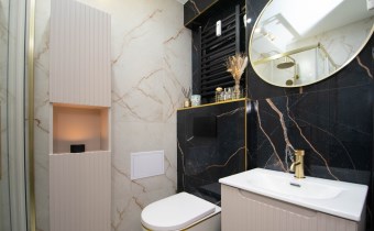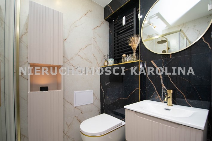- łazienka o powierzchni 3,04 m² : nowoczesna kabina 90 z brodzikiem slim i baterią z termostatem , stelaż podtynkowy Geberit z misą w systemie tornado, wysokiej jakości glazura, nowoczesne ryflowane meble, pralka Haier z możliwością sterowania smartfonem.