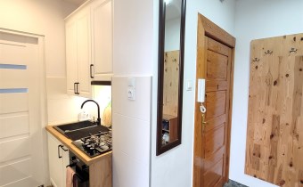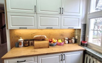 - nowa zabudowa kuchenna wraz z sprzętem AGD tj. płata gazowa, piekarnik elektryczny, okap pod szafkowy, pod szafkami wiszącymi zamontowane listwy z oświetleniem LED,