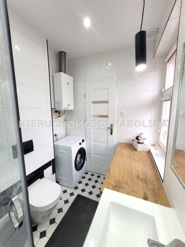 - w łazience szafki w zabudowie, NOEWY piecyk gazowy po podgrzewanie wody.