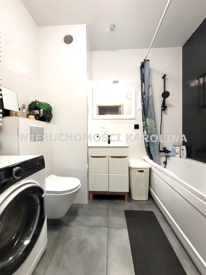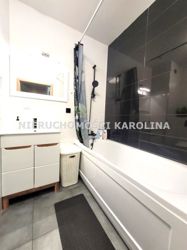 - ŁAZIENKA, która została wyposażona w wannę, toaletę podwieszaną, duże lustro, szafkę z umywalką, grzejnik typu drabinka. Zostało wygospodarowane również miejsce na pralkę.
